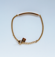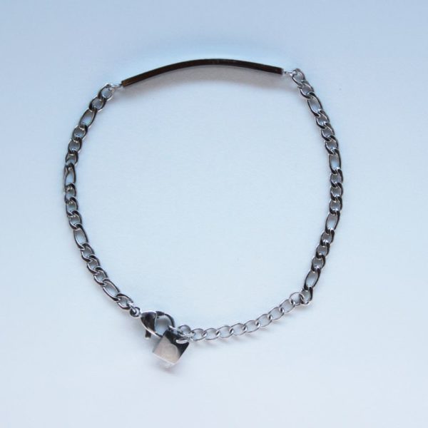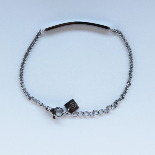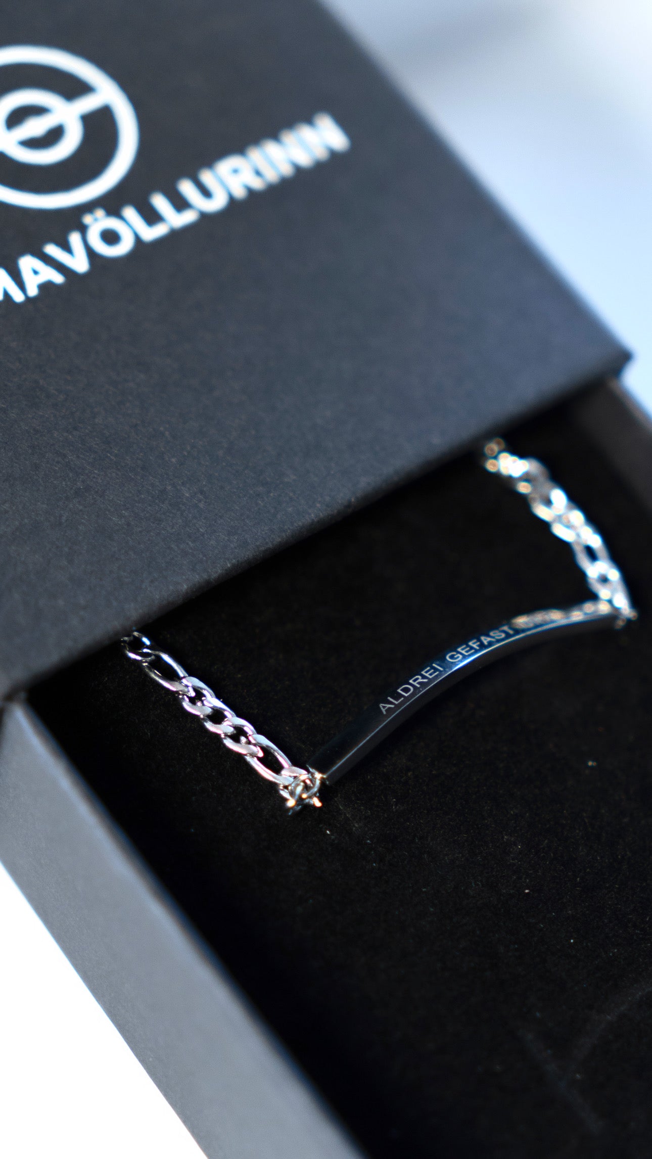 Keðjan er stílhrein og á armbandinu er skífa með áletruninni ALDREI GEFAST UPP.