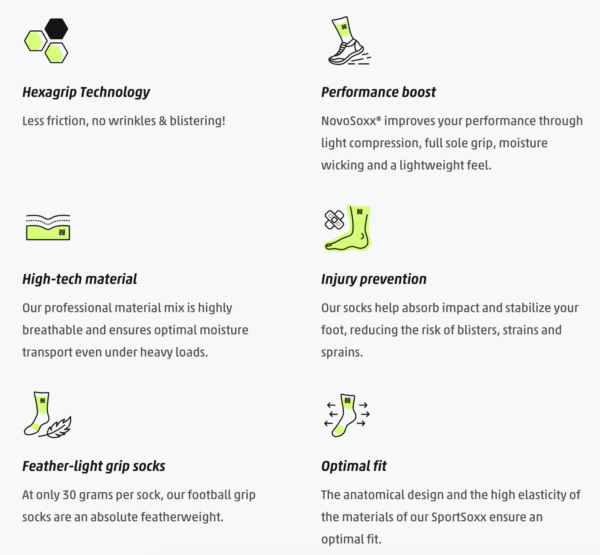 With the ultra-light Grip Socks from NovoSoxx® and their Hexa-Grip technology, you are unbeatable: Thanks to the non-slip studs, our football grip socks offer maximum grip, prevent injuries and increase your performance.